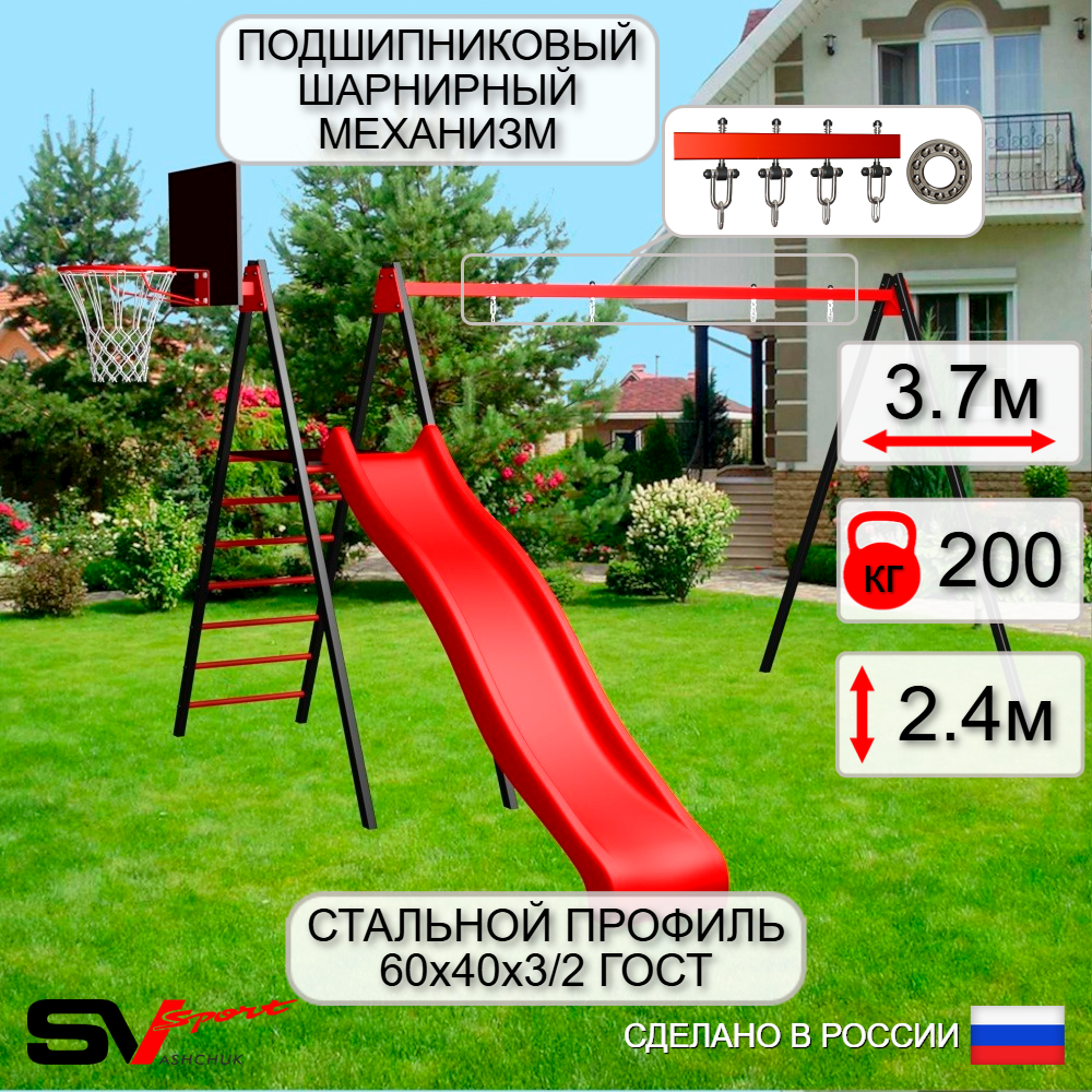 КОМПЛЕКТАЦИЯ: Каркас УК Sv Sport 3.7м, Щит баскетбольный Sv Sport c кронштейном к УК Sv Sport, Комплект горка Sv Sport к уличным качелям, Подвесы для качелей на подшипниках Sv Sport 2 компл.