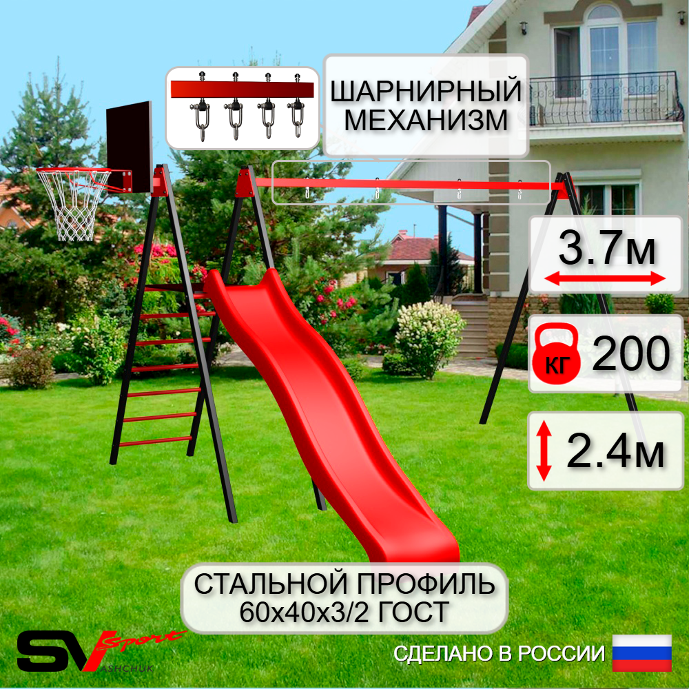 КОМПЛЕКТАЦИЯ: Каркас УК Sv Sport 3.7м, Щит баскетбольный Sv Sport c кронштейном к УК Sv Sport, Комплект горка Sv Sport к уличным качелям, Подвесы для качелей на втулке Sv Sport 2 компл.