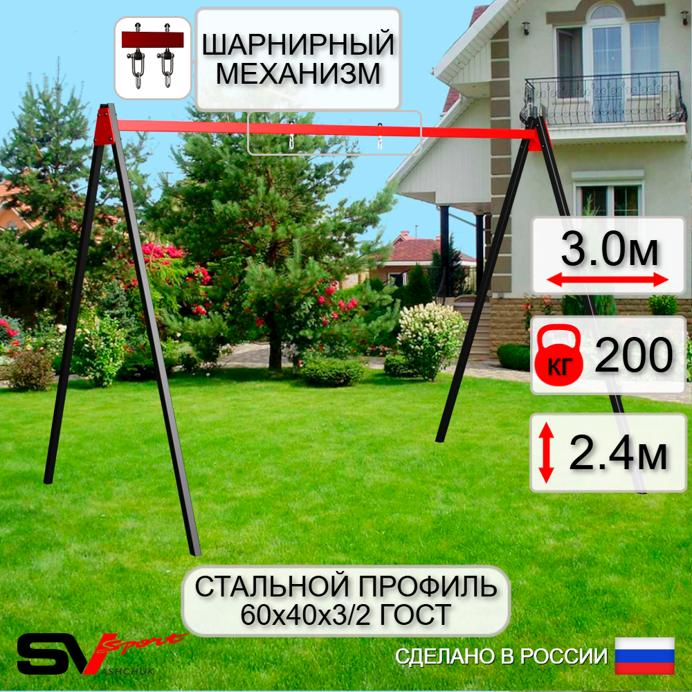 Уличные качели Sv Sport (перекладина) изготовлены из профильной трубы 60х40 мм, толщиной 3 мм, (опоры) 2 мм. Крепление перекладины изготовлено из пластины, толщиной 5 мм. Окрашены уличные качели качественной, импортной порошковой краской в 2 слоя, которая устойчива к истиранию и температурным перепадам. Все торцы, болты, гайки заглушены пластиковыми заглушками отличного качества. Использующиеся болты и гайки оцинкованы и соответствуют требованиям ГОСТ. Устанавливаются путем бетонировки на глубину не менее 30 см.