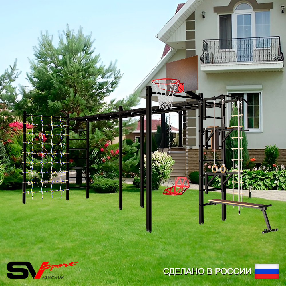 КОМПЛЕКТАЦИЯ: Каркас УШС Sv Sport Рукоход х 2, Турник Sv Sport стандарт к УШС, Брусья Sv Sport к УШС, Стойка под штангу Sv Sport к УШС, Скамья для пресса и жима Sv Sport к УШС, Качели пластиковые со спинкой на цепях, Щит баскетбольный Sv Sport c кронштейном к УШС Sv Sport, Комплект: канат с крепежом, кольца гимнастические деревянные, лестница веревочная, Комплект турник прямой.
