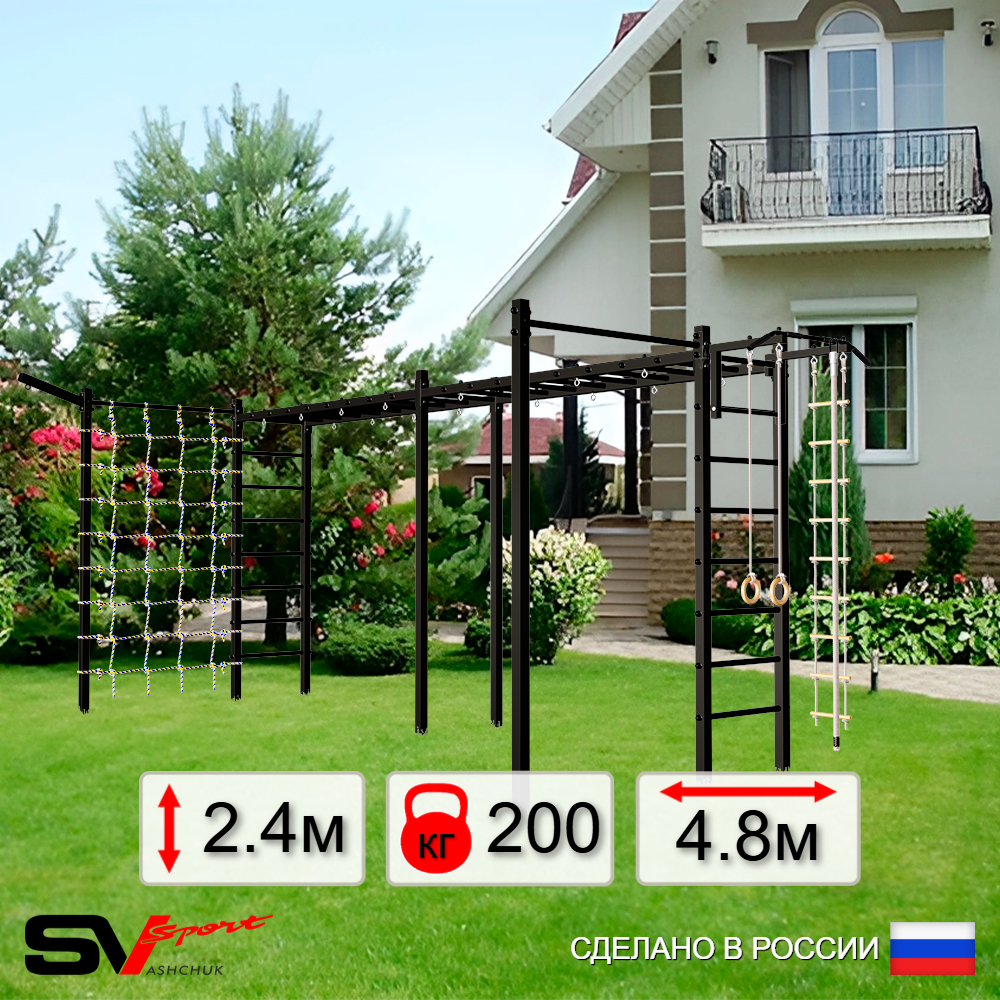 КОМПЛЕКТАЦИЯ: Каркас УШС Sv Sport Рукоход х 2, Турник Sv Sport стандарт к УШС, Качели пластиковые со спинкой на цепях, Кронштейн для подвеса боксерского мешка, Комплект: канат с крепежом, кольца гимнастические деревянные, лестница веревочная, Сетка к спортивному комплексу, Комплект турник прямой 2шт.