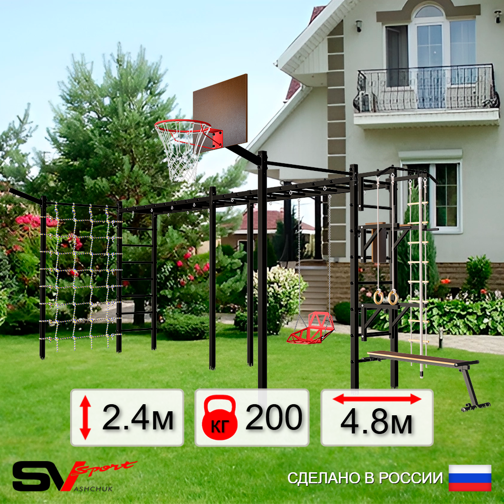 КОМПЛЕКТАЦИЯ: Каркас УШС Sv Sport Рукоход х 2, Турник Sv Sport стандарт к УШС, Брусья Sv Sport к УШС, Стойка под штангу Sv Sport к УШС, Скамья для пресса и жима Sv Sport к УШС, Качели пластиковые со спинкой на цепях, Щит баскетбольный Sv Sport c кронштейном к УШС Sv Sport, Кронштейн для подвеса боксерского мешка, Комплект: канат с крепежом, кольца гимнастические деревянные, лестница веревочная, Комплект турник прямой.