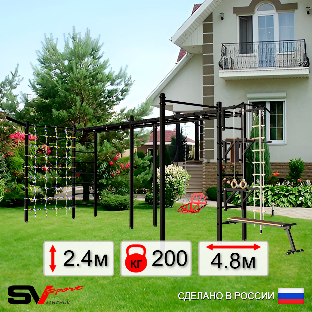 КОМПЛЕКТАЦИЯ: Каркас УШС Sv Sport Рукоход х 2, Турник Sv Sport стандарт к УШС, Брусья Sv Sport к УШС, Стойка под штангу Sv Sport к УШС, Скамья для пресса и жима Sv Sport к УШС, Качели пластиковые со спинкой на цепях, Кронштейн для подвеса боксерского мешка, Комплект: канат с крепежом, кольца гимнастические деревянные, лестница веревочная, Комплект турник прямой.