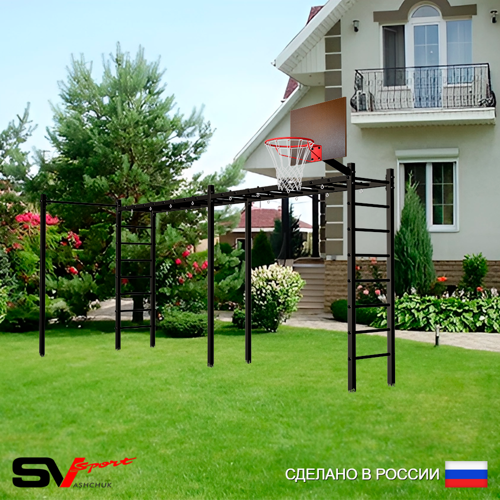 КОМПЛЕКТАЦИЯ: Каркас УШС Sv Sport Рукоход х 2, Щит баскетбольный Sv Sport c кронштейном к УШС Sv Sport, Комплект турник прямой.