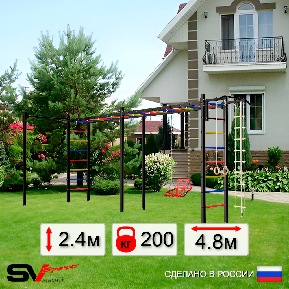 КОМПЛЕКТАЦИЯ: Каркас УШС Sv Sport Рукоход х 2, Турник Sv Sport стандарт к УШС, Качели пластиковые со спинкой на цепях, Комплект: канат с крепежом, кольца гимнастические деревянные, лестница веревочная, Комплект турник прямой.