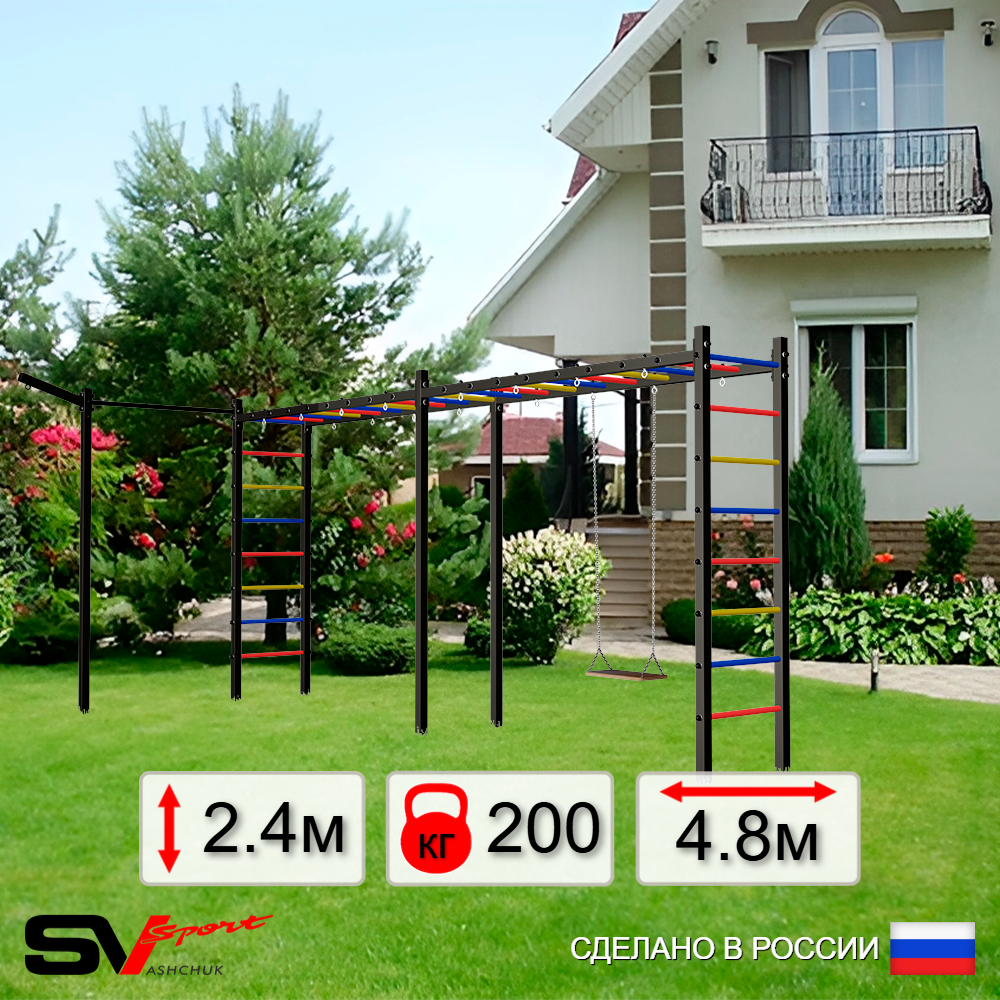 КОМПЛЕКТАЦИЯ: Каркас УШС Sv Sport Рукоход х 2, Качели деревянные на цепях Sv Sport, Кронштейн для подвеса боксерского мешка, Комплект турник прямой.