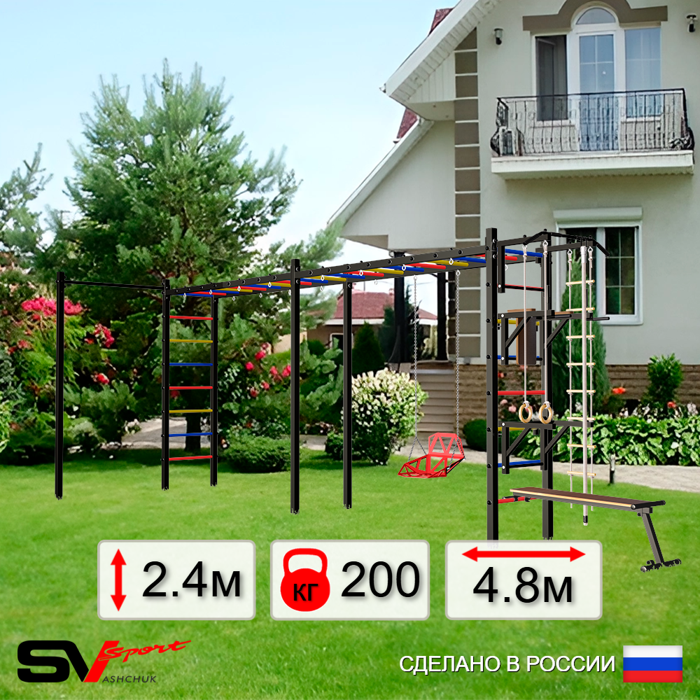КОМПЛЕКТАЦИЯ: Каркас УШС Sv Sport Рукоход х 2, Турник Sv Sport стандарт к УШС, Брусья Sv Sport к УШС, Стойка под штангу Sv Sport к УШС, Скамья для пресса и жима Sv Sport к УШС, Качели пластиковые со спинкой на цепях, Комплект: канат с крепежом, кольца гимнастические деревянные, лестница веревочная, Комплект турник прямой.