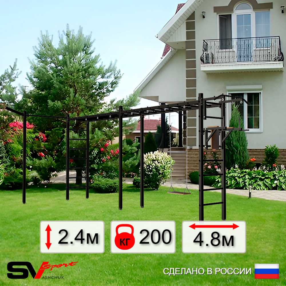 КОМПЛЕКТАЦИЯ: Каркас УШС Sv Sport Рукоход х 2, Турник Sv Sport стандарт к УШС, Брусья Sv Sport к УШС, Качели деревянные на цепях Sv Sport, Кронштейн для подвеса боксерского мешка, Комплект турник прямой.