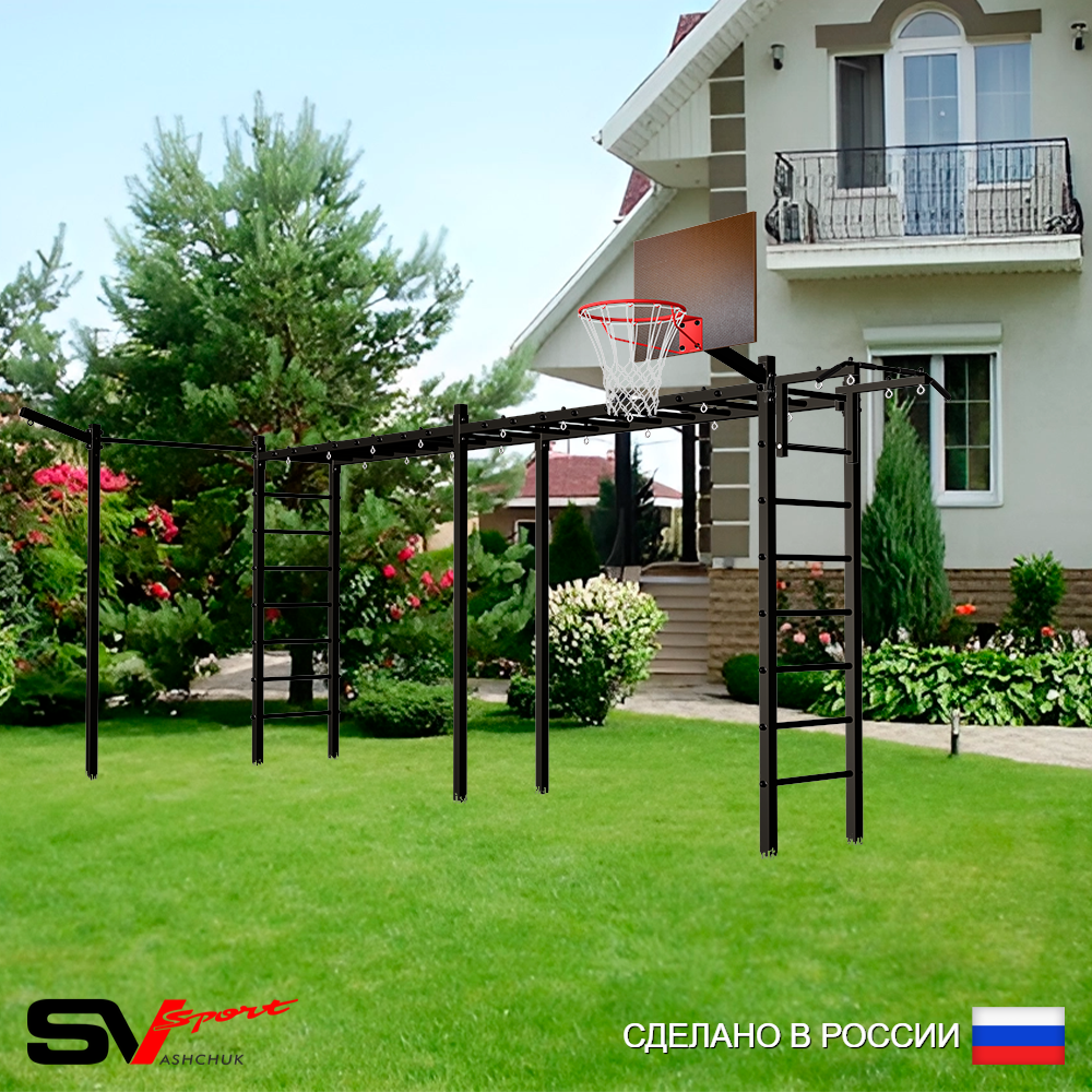 КОМПЛЕКТАЦИЯ: Каркас УШС Sv Sport Рукоход х 2, Турник Sv Sport стандарт к УШС, Щит баскетбольный Sv Sport c кронштейном к УШС Sv Sport, Кронштейн для подвеса боксерского мешка, Комплект турник прямой.