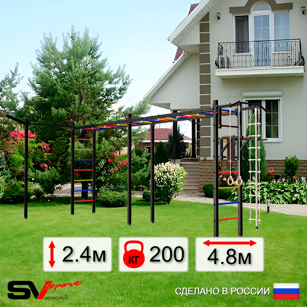 КОМПЛЕКТАЦИЯ: Каркас УШС Sv Sport Рукоход х 2, Турник Sv Sport стандарт к УШС, Брусья Sv Sport к УШС, Кронштейн для подвеса боксерского мешка, Комплект: канат с крепежом, кольца гимнастические деревянные, лестница веревочная, Комплект турник прямой.
