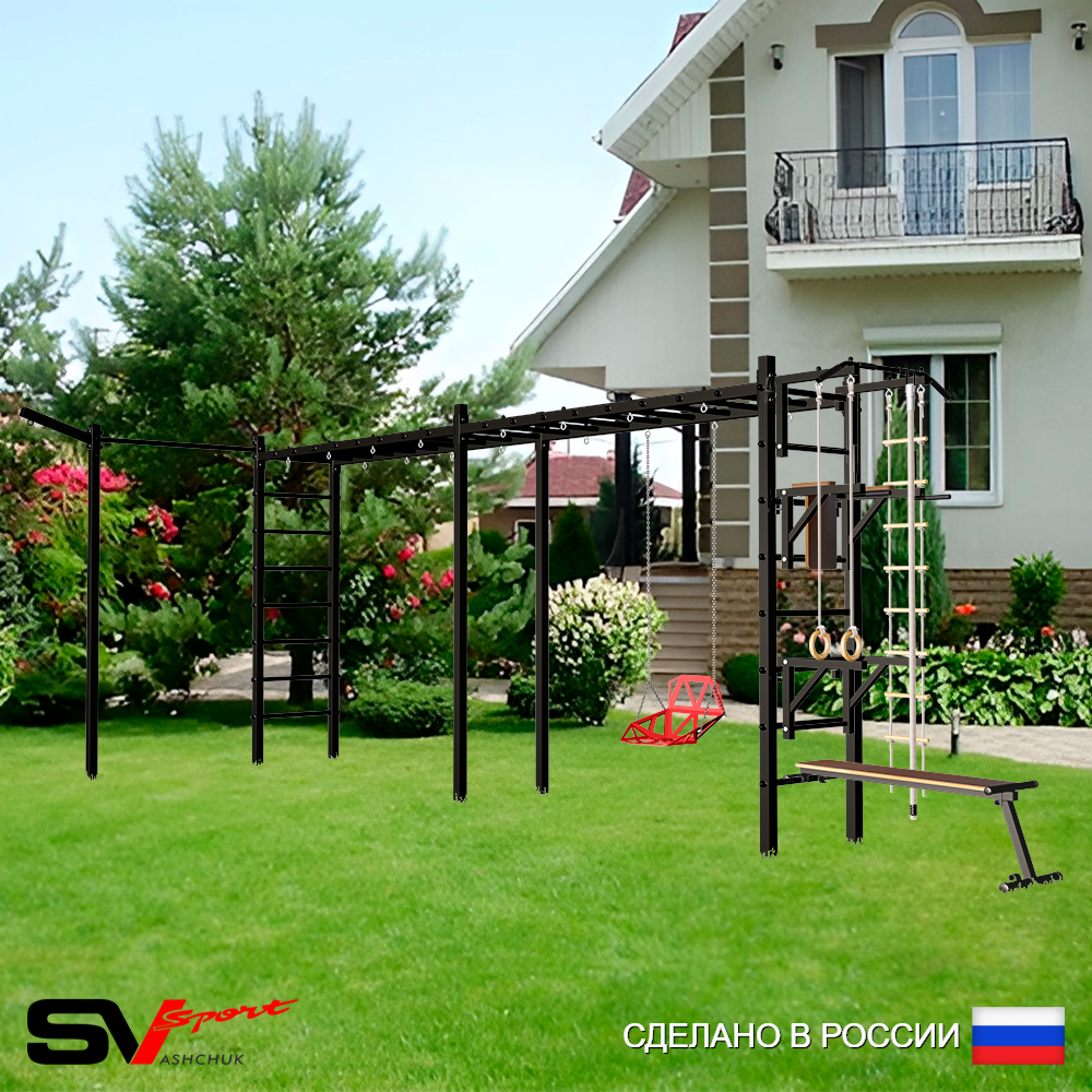 КОМПЛЕКТАЦИЯ: Каркас УШС Sv Sport Рукоход х 2, Турник Sv Sport стандарт к УШС, Брусья Sv Sport к УШС, Стойка под штангу Sv Sport к УШС, Скамья для пресса и жима Sv Sport к УШС, Качели пластиковые со спинкой на цепях, Кронштейн для подвеса боксерского мешка, Комплект: канат с крепежом, кольца гимнастические деревянные, лестница веревочная, Комплект турник прямой.