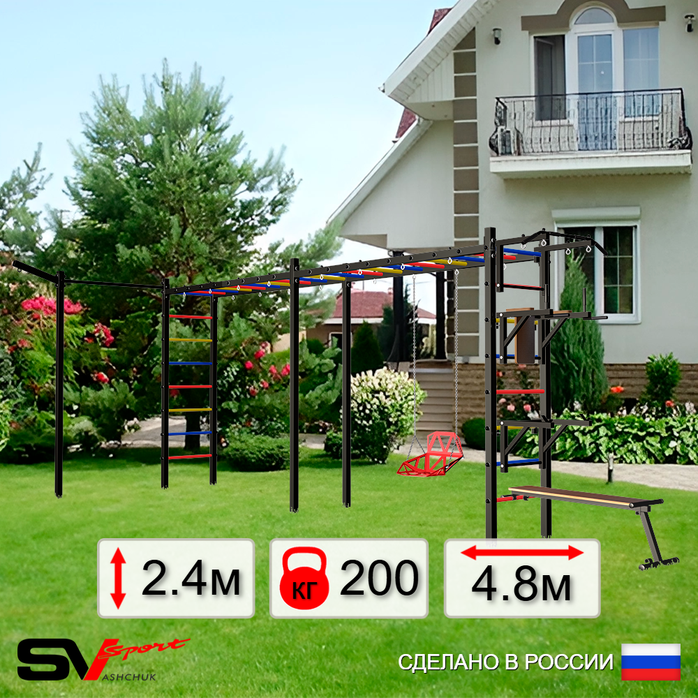 КОМПЛЕКТАЦИЯ: Каркас УШС Sv Sport Рукоход х 2, Турник Sv Sport стандарт к УШС, Брусья Sv Sport к УШС, Стойка под штангу Sv Sport к УШС, Скамья для пресса и жима Sv Sport к УШС, Качели пластиковые со спинкой на цепях, Кронштейн для подвеса боксерского мешка, Комплект турник прямой.