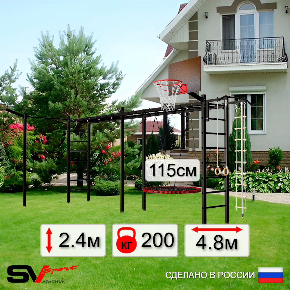 КОМПЛЕКТАЦИЯ: Каркас УШС Sv Sport Рукоход х 2, Турник Sv Sport стандарт к УШС, Качели - гнездо 115см, Щит баскетбольный Sv Sport c кронштейном к УШС Sv Sport, Кронштейн для подвеса боксерского мешка, Комплект: канат с крепежом, кольца гимнастические деревянные, лестница веревочная, Комплект турник прямой.