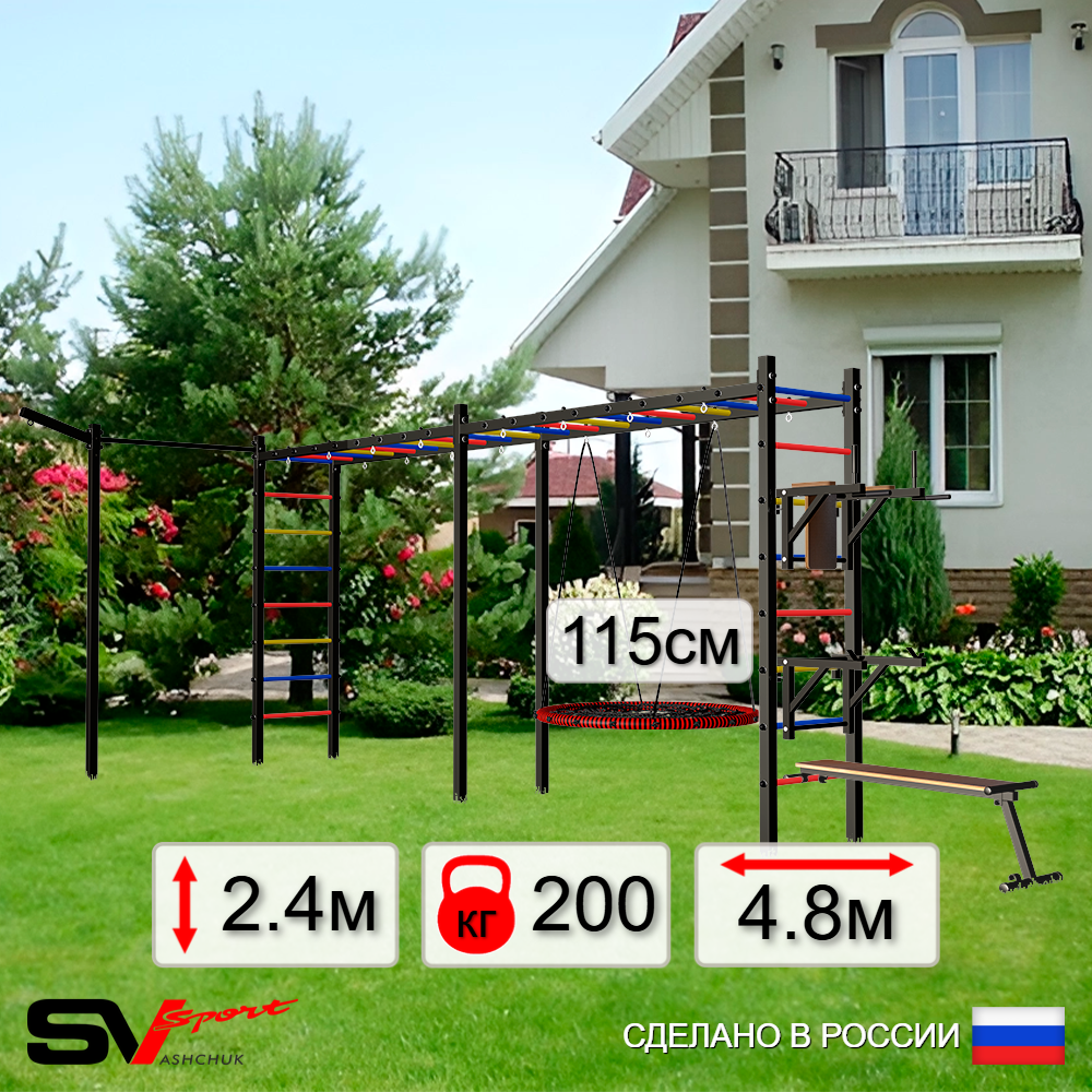 КОМПЛЕКТАЦИЯ: Каркас УШС Sv Sport Рукоход х 2, Брусья Sv Sport к УШС, Стойка под штангу Sv Sport к УШС, Скамья для пресса и жима Sv Sport к УШС, Качели - гнездо 115см, Кронштейн для подвеса боксерского мешка, Комплект турник прямой.