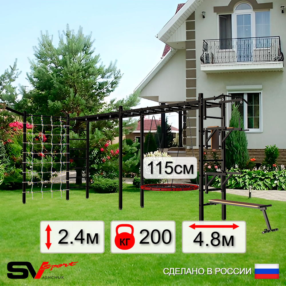 КОМПЛЕКТАЦИЯ: Каркас УШС Sv Sport Рукоход х 2, Турник Sv Sport стандарт к УШС, Брусья Sv Sport к УШС, Скамья для пресса и жима Sv Sport к УШС, Качели деревянные на цепях Sv Sport, Щит баскетбольный Sv Sport c кронштейном к УШС Sv Sport, Кронштейн для подвеса боксерского мешка, Комплект: канат с крепежом, кольца гимнастические деревянные, лестница веревочная, Сетка к спортивному комплексу, Комплект турник прямой 2шт.