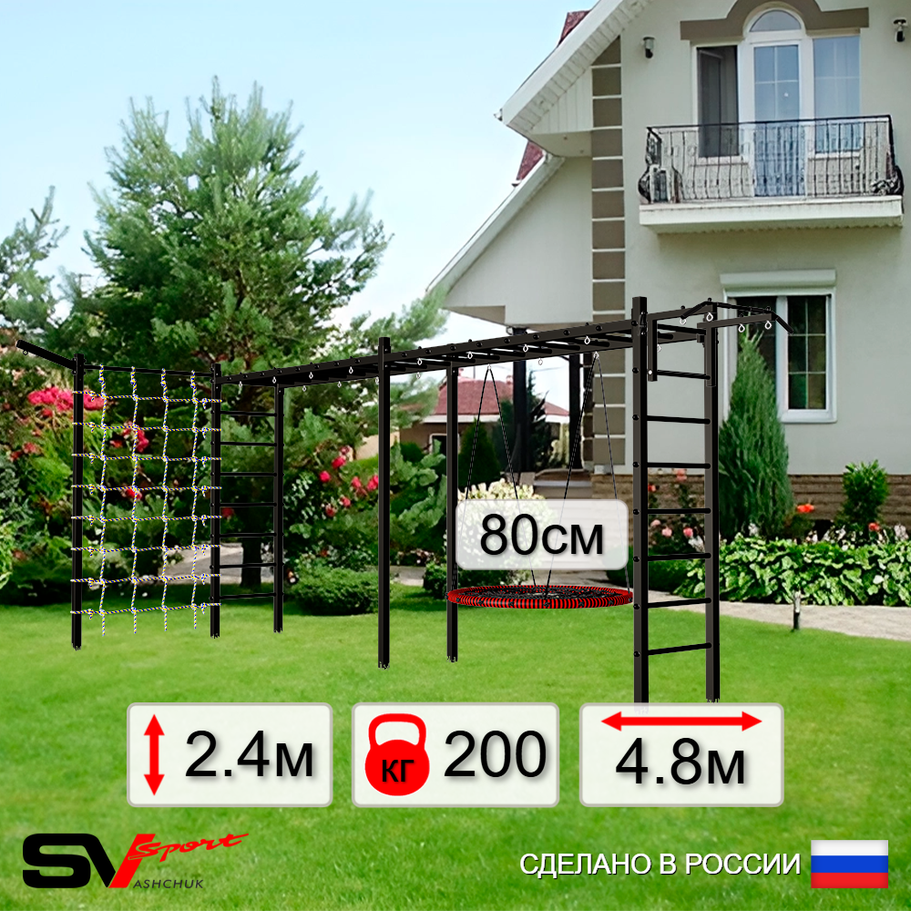 КОМПЛЕКТАЦИЯ: Каркас УШС Sv Sport Рукоход х 2, Брусья Sv Sport к УШС, Качели деревянные на цепях Sv Sport, Щит баскетбольный Sv Sport c кронштейном к УШС Sv Sport, Сетка к спортивному комплексу, Комплект турник прямой 2шт.