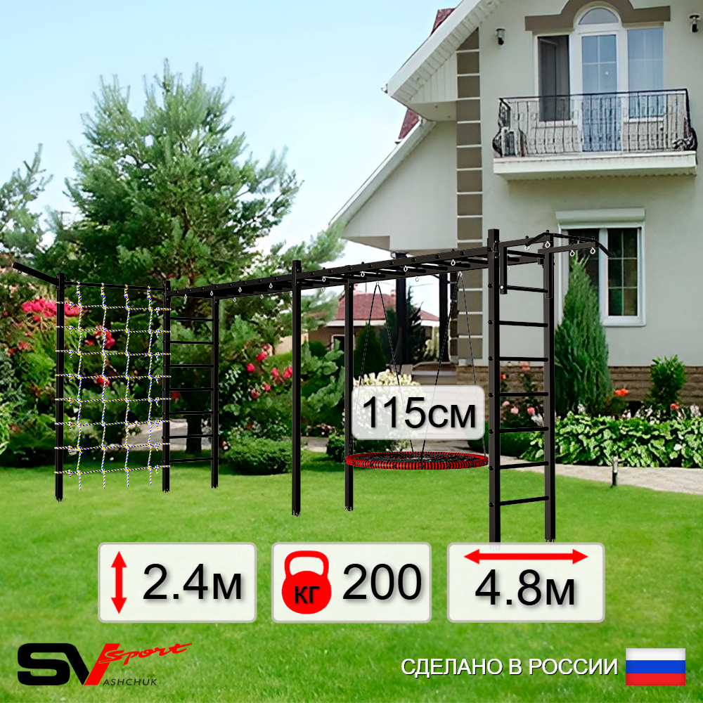 КОМПЛЕКТАЦИЯ: Каркас УШС Sv Sport Рукоход х 2, Брусья Sv Sport к УШС, Стойка под штангу Sv Sport к УШС, Скамья для пресса и жима Sv Sport к УШС, Качели деревянные на цепях Sv Sport, Щит баскетбольный Sv Sport c кронштейном к УШС Sv Sport, Сетка к спортивному комплексу, Комплект турник прямой 2шт.