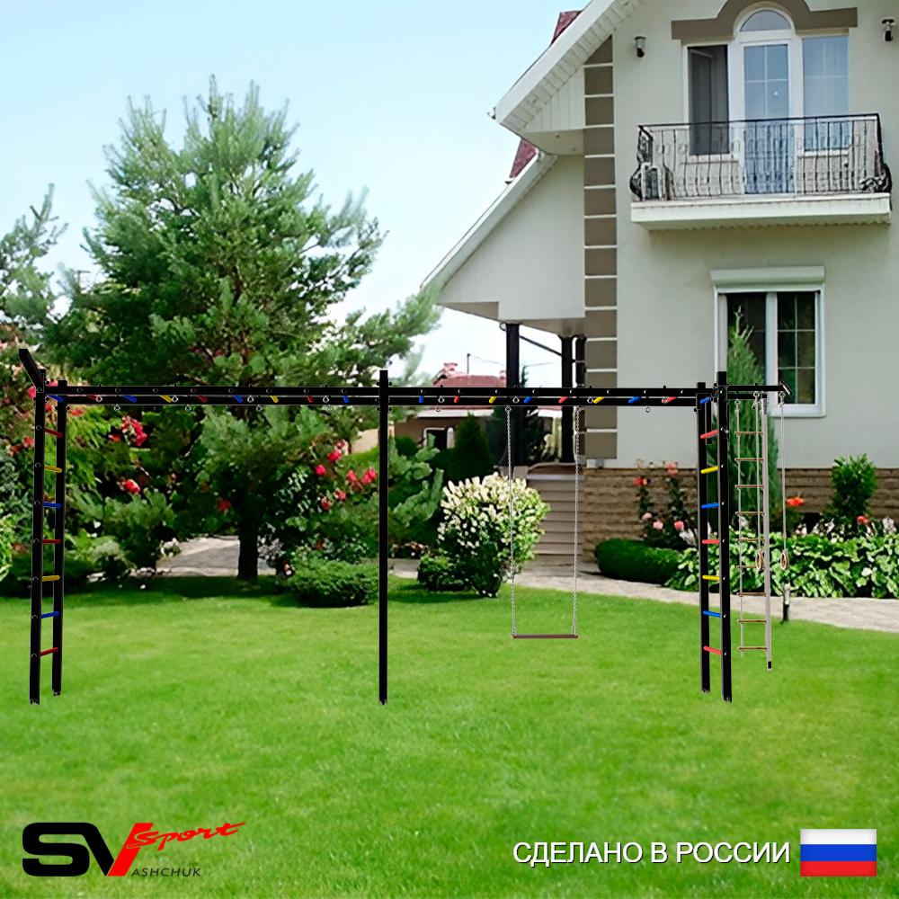 КОМПЛЕКТАЦИЯ: Каркас УШС Sv Sport Рукоход х 2, Турник Sv Sport стандарт к УШС, Качели пластиковые со спинкой на цепях, Комплект: канат с крепежом, кольца гимнастические деревянные, лестница веревочная.