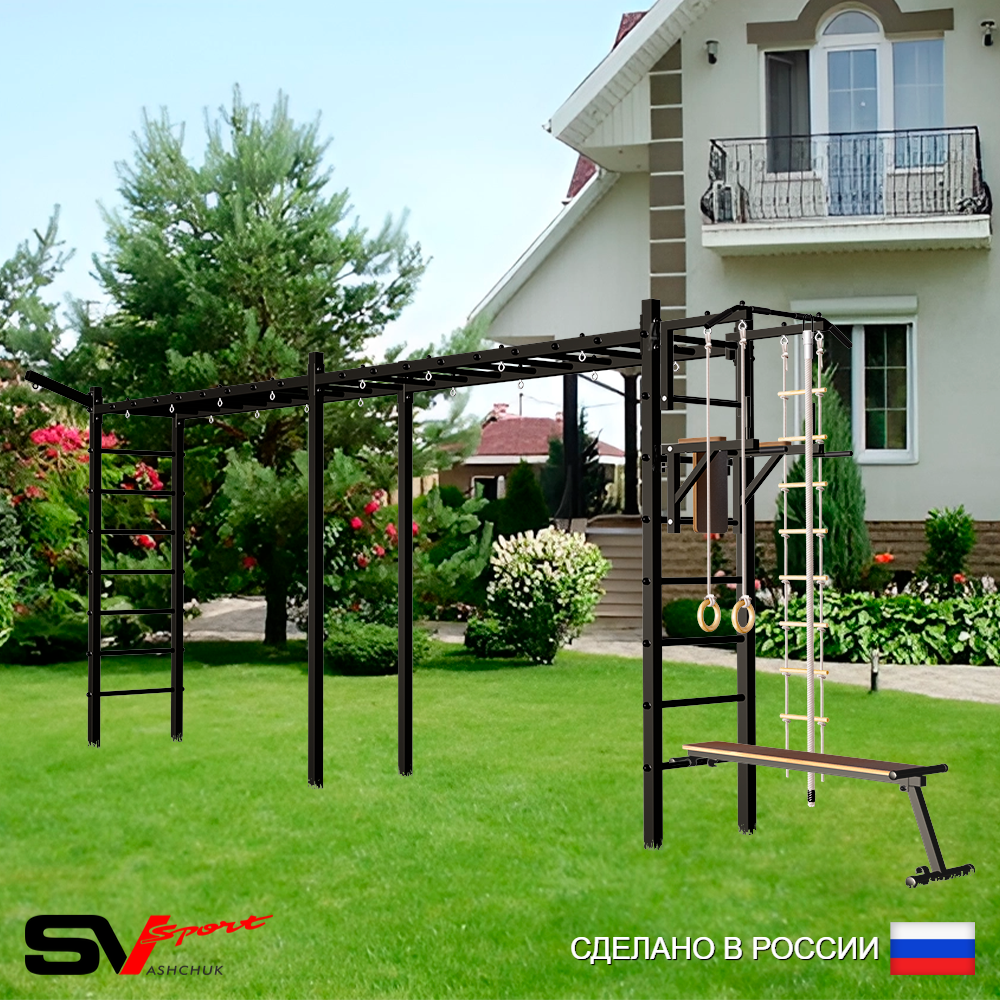 КОМПЛЕКТАЦИЯ: Каркас УШС Sv Sport Рукоход х 2, Турник Sv Sport стандарт к УШС, Брусья Sv Sport к УШС, Стойка под штангу Sv Sport к УШС, Скамья для пресса и жима Sv Sport к УШС, Качели - гнездо 80см, Кронштейн для подвеса боксерского мешка, Комплект: канат с крепежом, кольца гимнастические деревянные, лестница веревочная.
