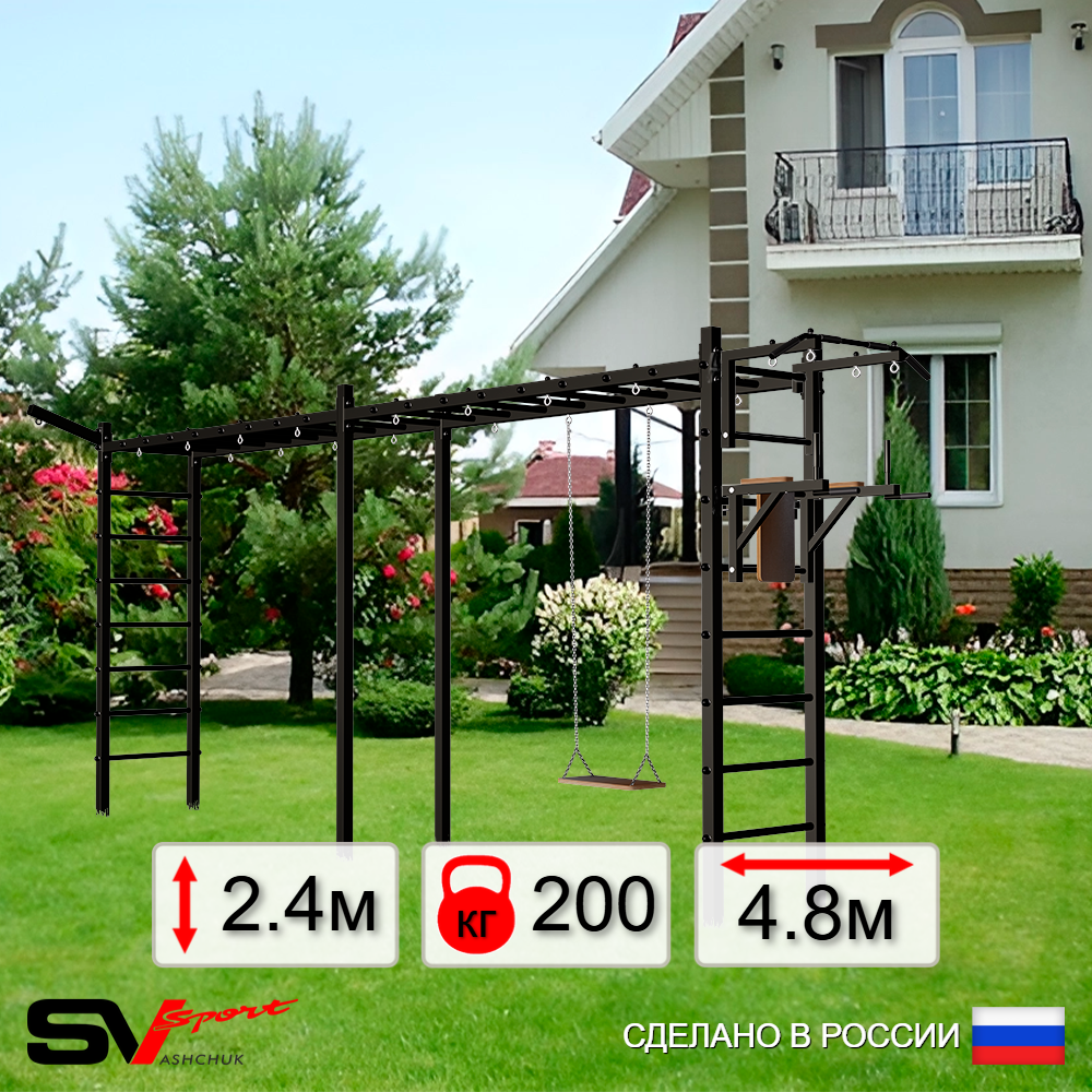 КОМПЛЕКТАЦИЯ: Каркас УШС Sv Sport Рукоход х 2, Турник Sv Sport стандарт к УШС, Брусья Sv Sport к УШС, Стойка под штангу Sv Sport к УШС, Скамья для пресса и жима Sv Sport к УШС, Качели пластиковые со спинкой на цепях.