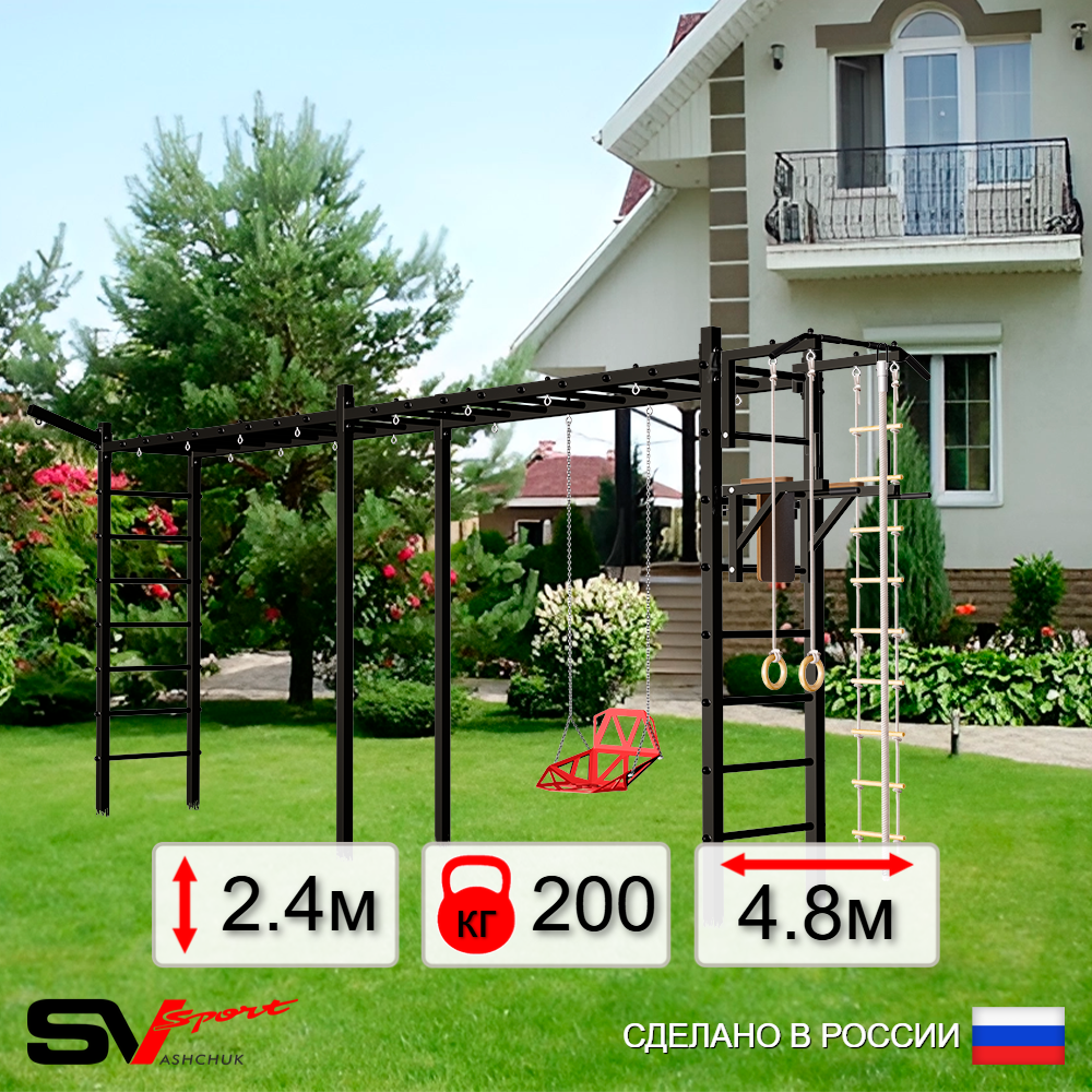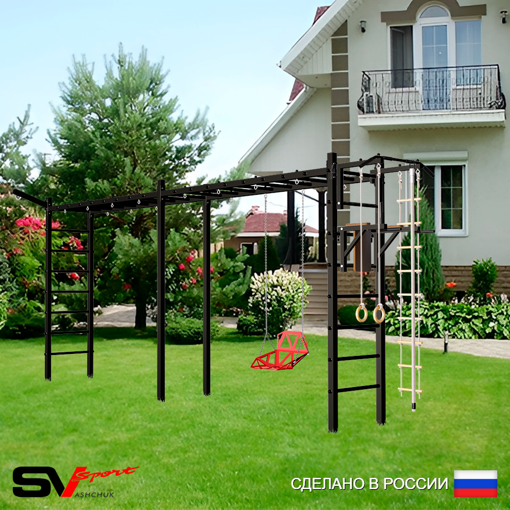 КОМПЛЕКТАЦИЯ: Каркас УШС Sv Sport Рукоход х 2, Турник Sv Sport стандарт к УШС, Брусья Sv Sport к УШС, Скамья для пресса и жима Sv Sport к УШС, Качели - гнездо 115см, Кронштейн для подвеса боксерского мешка, Комплект: канат с крепежом, кольца гимнастические деревянные, лестница веревочная, Сетка к спортивному комплексу, Комплект турник прямой.