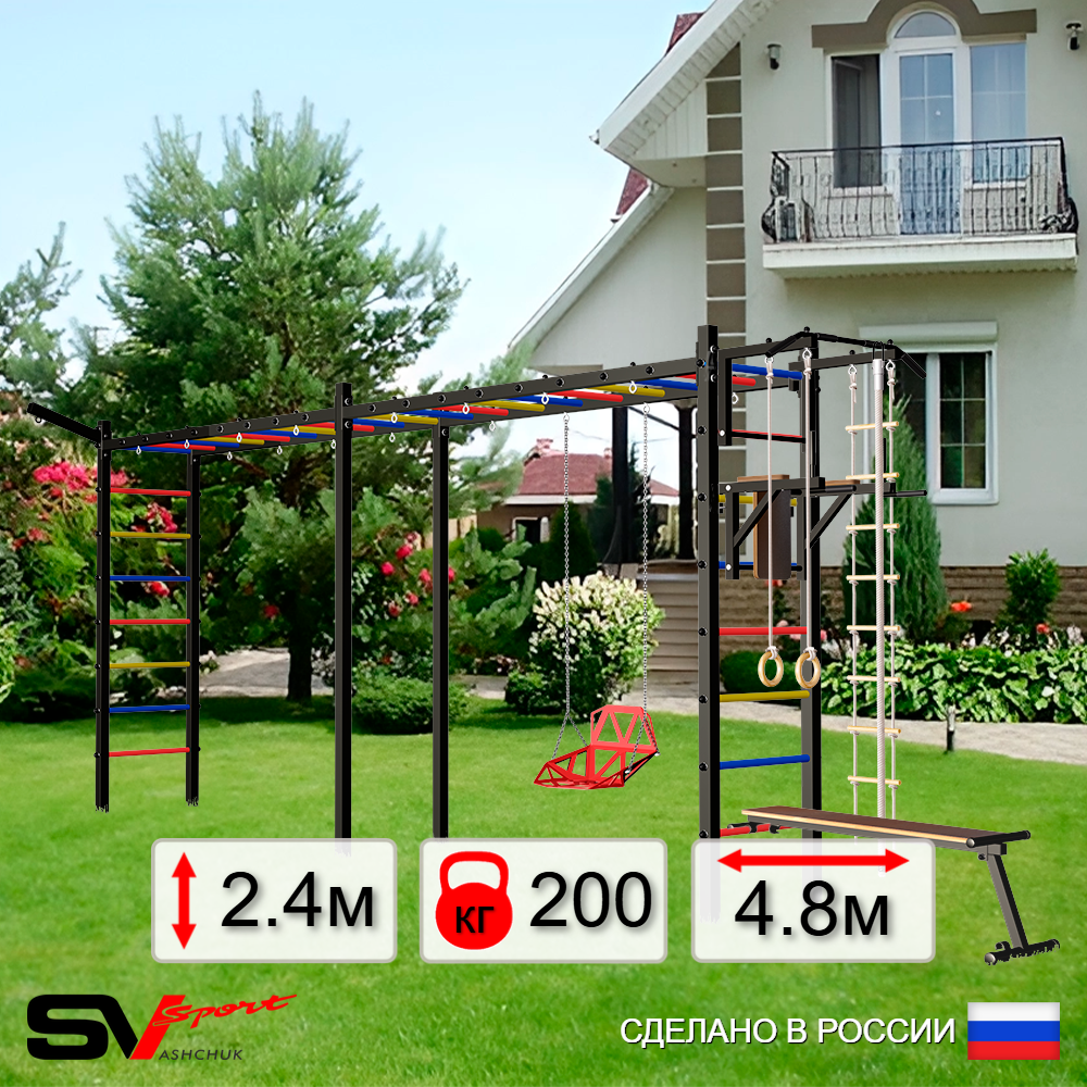 КОМПЛЕКТАЦИЯ: Каркас УШС Sv Sport Рукоход х 2, Турник Sv Sport стандарт к УШС, Брусья Sv Sport к УШС, Стойка под штангу Sv Sport к УШС, Скамья для пресса и жима Sv Sport к УШС, Качели - гнездо 80см, Кронштейн для подвеса боксерского мешка, Комплект: канат с крепежом, кольца гимнастические деревянные, лестница веревочная, Сетка к спортивному комплексу, Комплект турник прямой.
