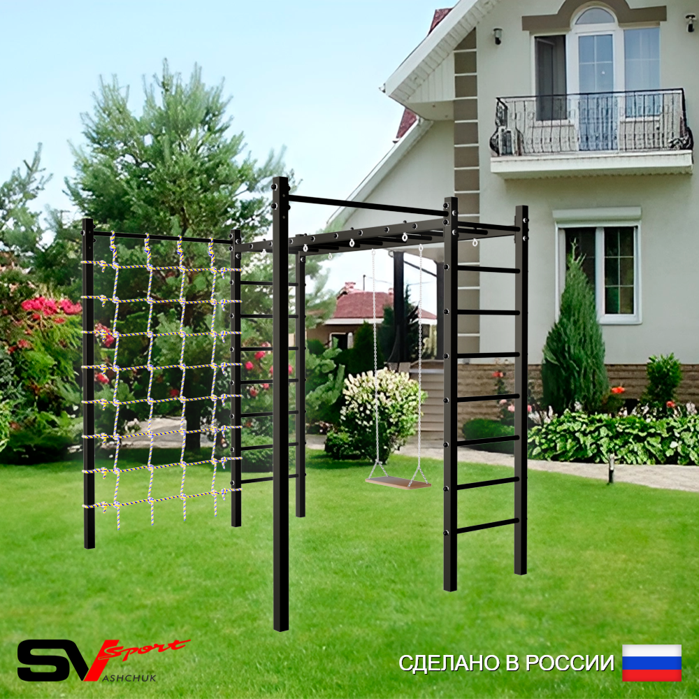 КОМПЛЕКТАЦИЯ: Каркас УШС Sv Sport Рукоход, Турник Sv Sport стандарт к УШС, Качели - гнездо 80см, Щит баскетбольный Sv Sport c кронштейном к УШС Sv Sport, Сетка к спортивному комплексу, Комплект турник прямой 2шт.