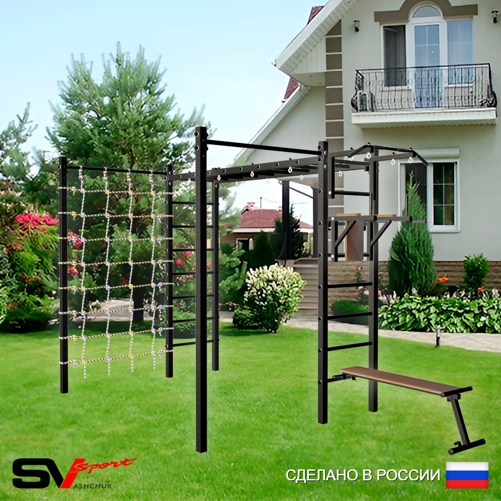 КОМПЛЕКТАЦИЯ: Каркас УШС Sv Sport Рукоход, Брусья Sv Sport к УШС, Скамья для пресса и жима Sv Sport к УШС, Качели - гнездо 115см, Сетка к спортивному комплексу, Комплект турник прямой 2шт.