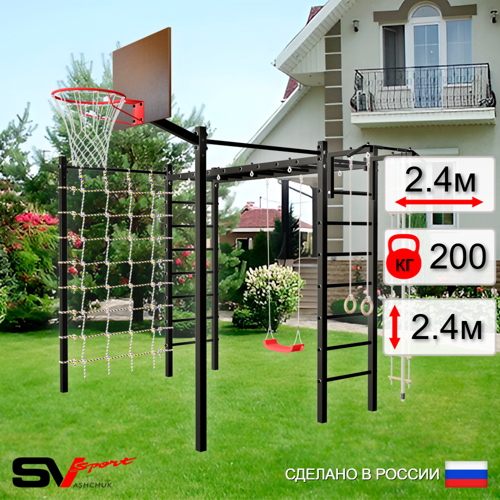 КОМПЛЕКТАЦИЯ: Каркас УШС Sv Sport Рукоход, Брусья Sv Sport к УШС, Качели - гнездо 100см, Щит баскетбольный Sv Sport c кронштейном к УШС Sv Sport, Кронштейн для подвеса боксерского мешка, Сетка к спортивному комплексу, Комплект турник прямой 2шт.