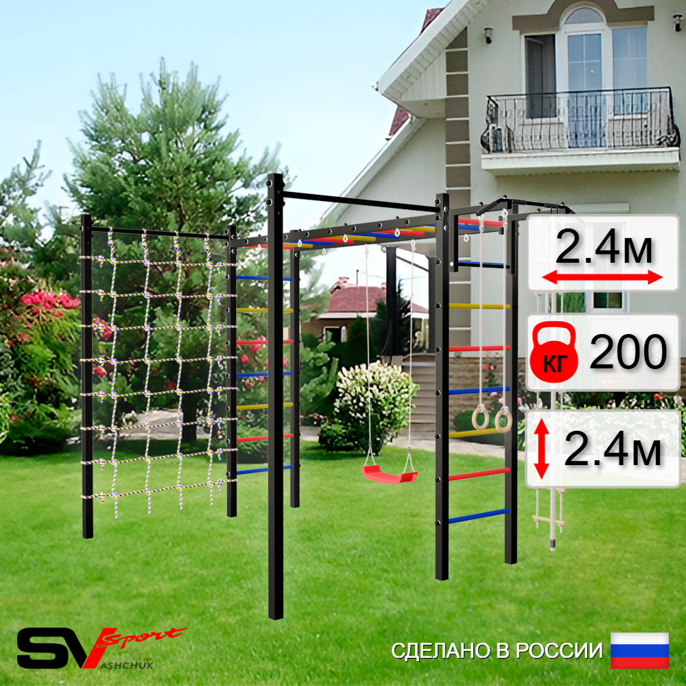 КОМПЛЕКТАЦИЯ: Каркас УШС Sv Sport Рукоход, Турник Sv Sport стандарт к УШС, Брусья Sv Sport к УШС, Качели - гнездо 100см, Кронштейн для подвеса боксерского мешка, Комплект: канат с крепежом, кольца гимнастические деревянные, лестница веревочная, Сетка к спортивному комплексу, Комплект турник прямой 2шт.