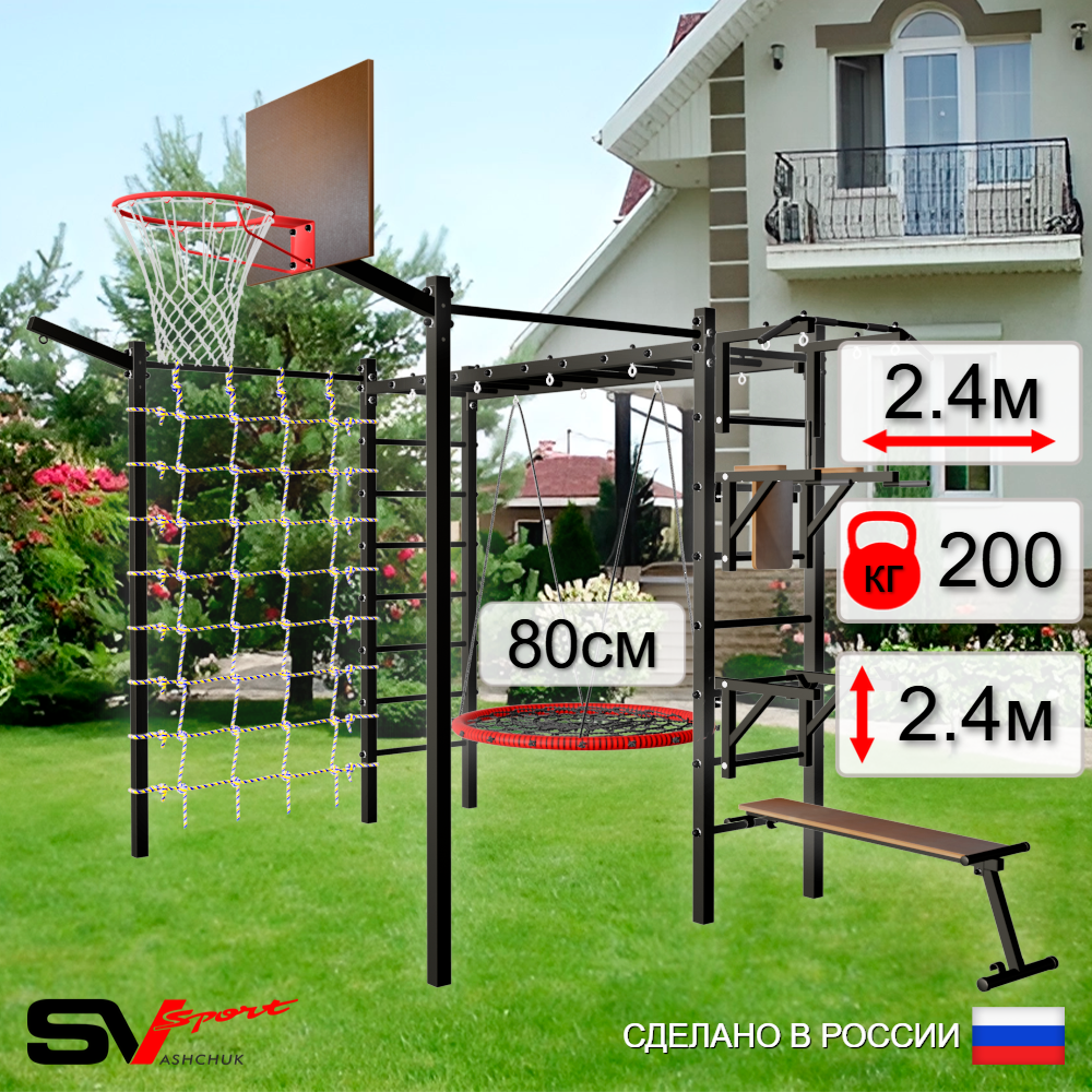 КОМПЛЕКТАЦИЯ: Каркас УШС Sv Sport Рукоход х 2, Турник Sv Sport стандарт к УШС, Брусья Sv Sport к УШС, Качели деревянные на цепях Sv Sport, Кронштейн для подвеса боксерского мешка, Комплект: канат с крепежом, кольца гимнастические деревянные, лестница веревочная.