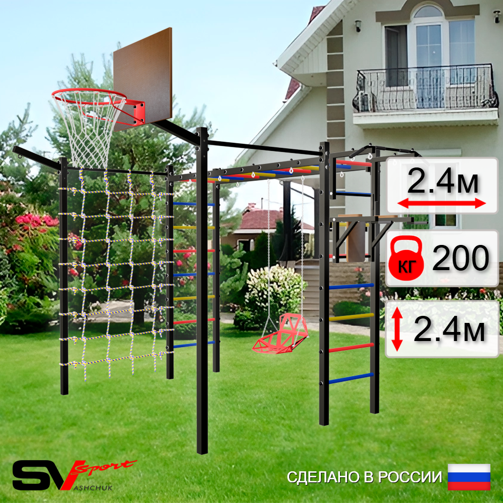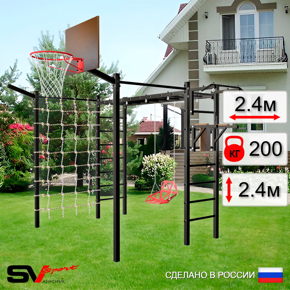 КОМПЛЕКТАЦИЯ: Каркас УШС Sv Sport Рукоход х 2, Турник Sv Sport стандарт к УШС, Брусья Sv Sport к УШС, Стойка под штангу Sv Sport к УШС, Скамья для пресса и жима Sv Sport к УШС, Качели - гнездо 100см.