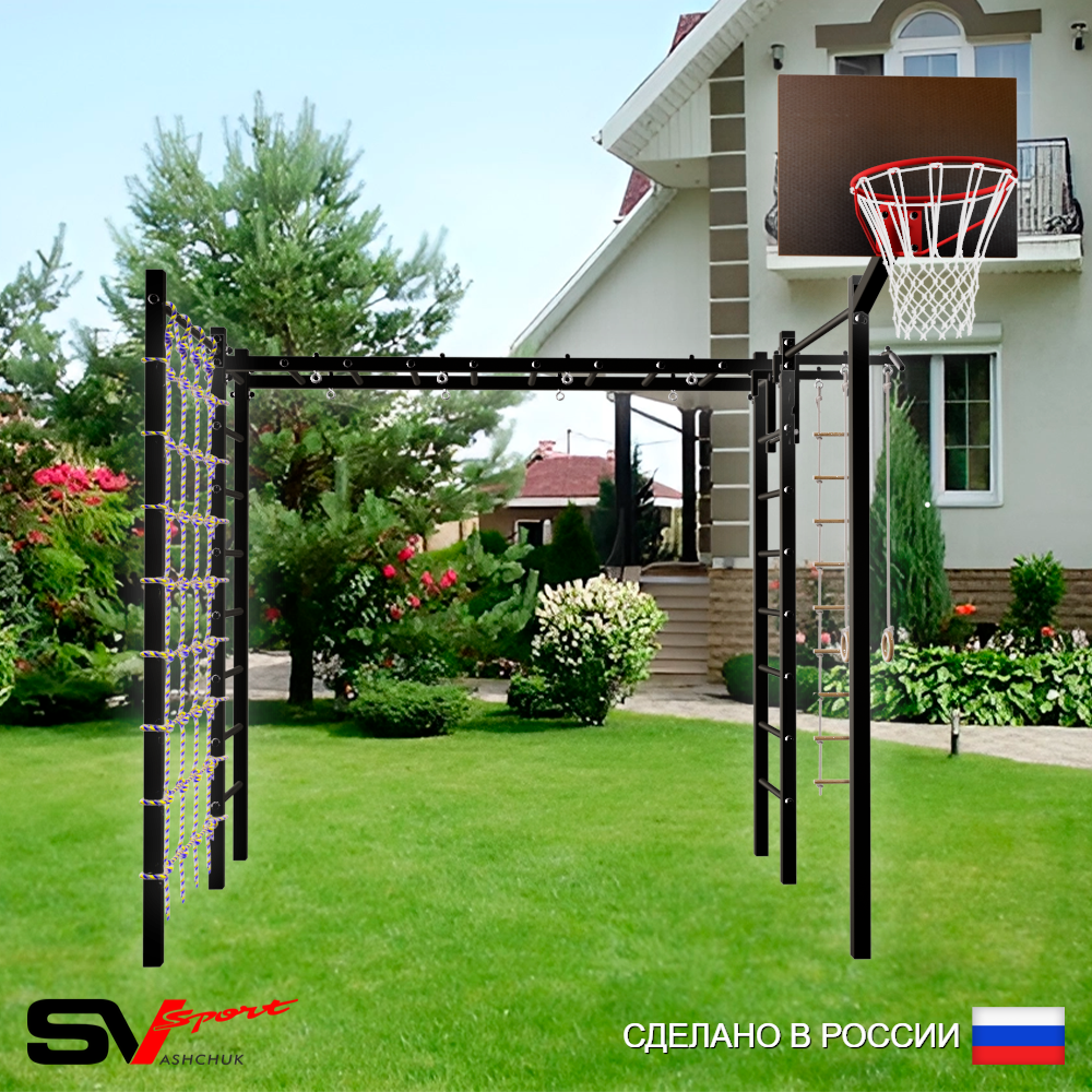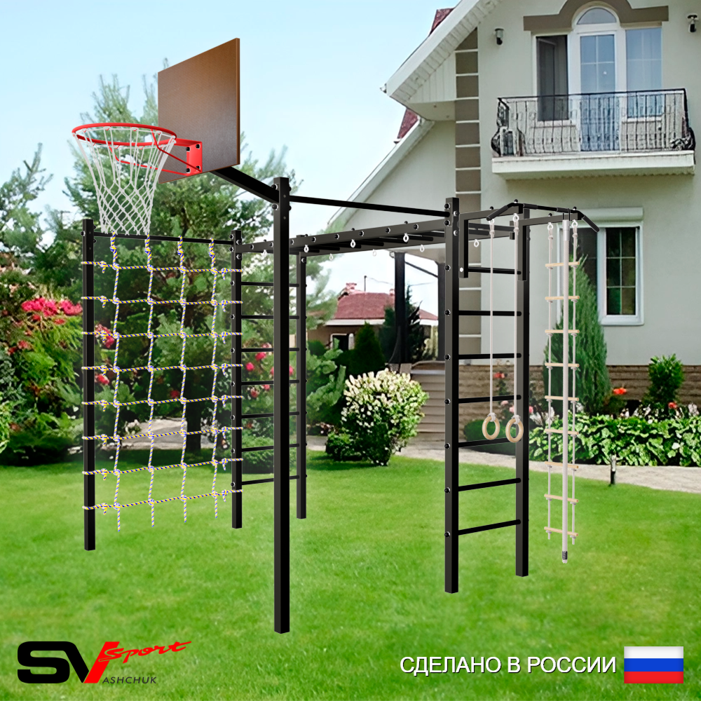 КОМПЛЕКТАЦИЯ: Каркас УШС Sv Sport Рукоход, Турник Sv Sport стандарт к УШС, Брусья Sv Sport к УШС, Качели - гнездо 100см, Кронштейн для подвеса боксерского мешка, Сетка к спортивному комплексу, Комплект турник прямой 2шт.