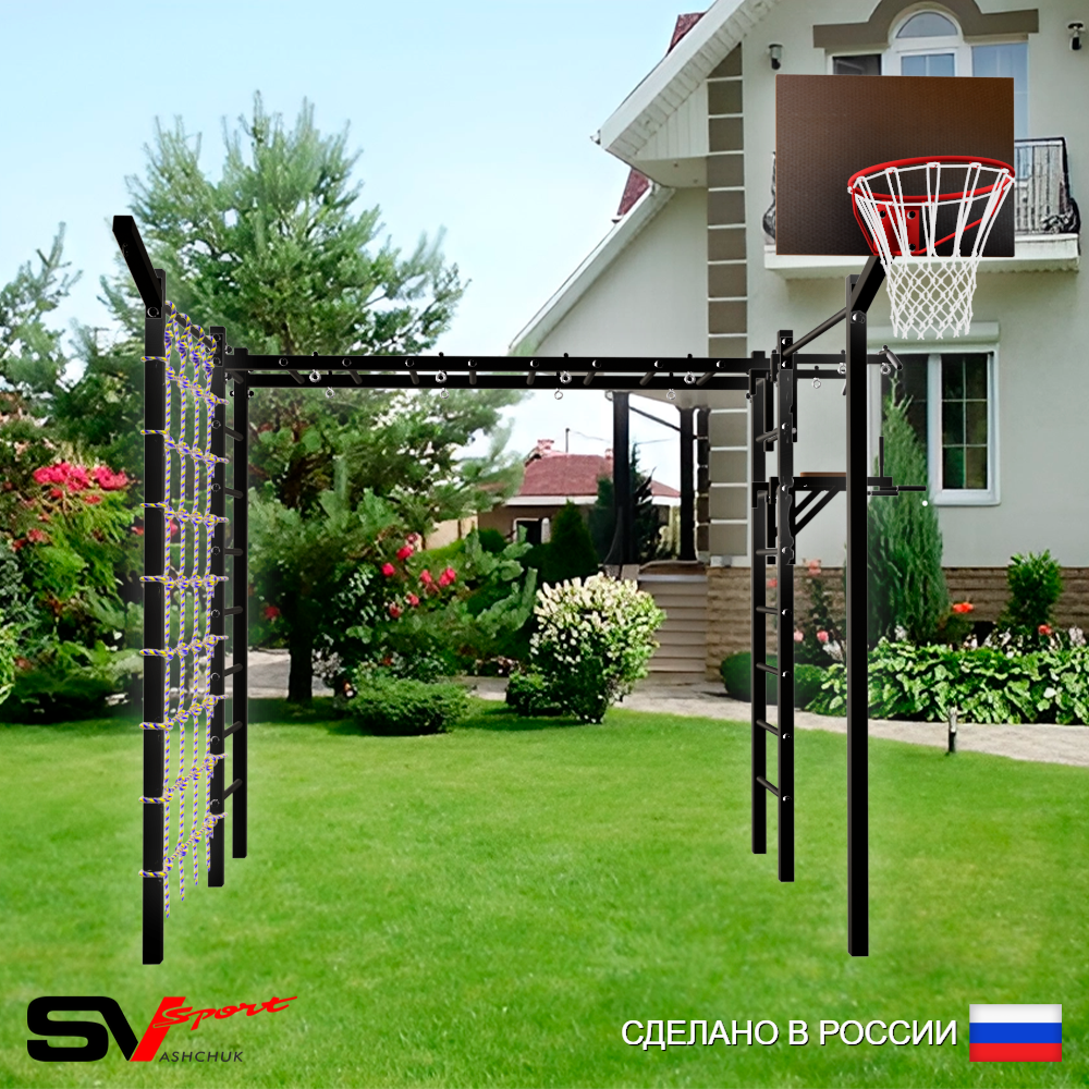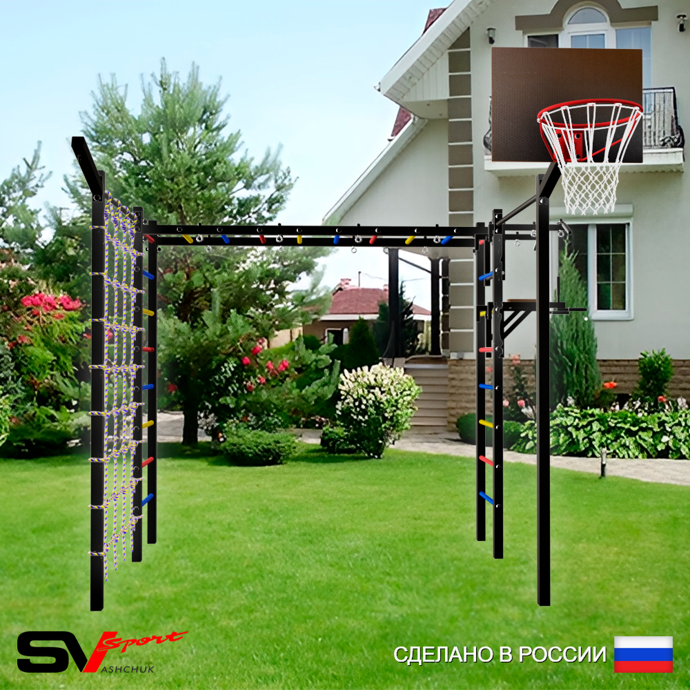 КОМПЛЕКТАЦИЯ: Каркас УШС Sv Sport Рукоход, Турник Sv Sport стандарт к УШС, Брусья Sv Sport к УШС, Стойка под штангу Sv Sport к УШС, Скамья для пресса и жима Sv Sport к УШС, Качели - гнездо 100см, Сетка к спортивному комплексу, Комплект турник прямой 2шт.