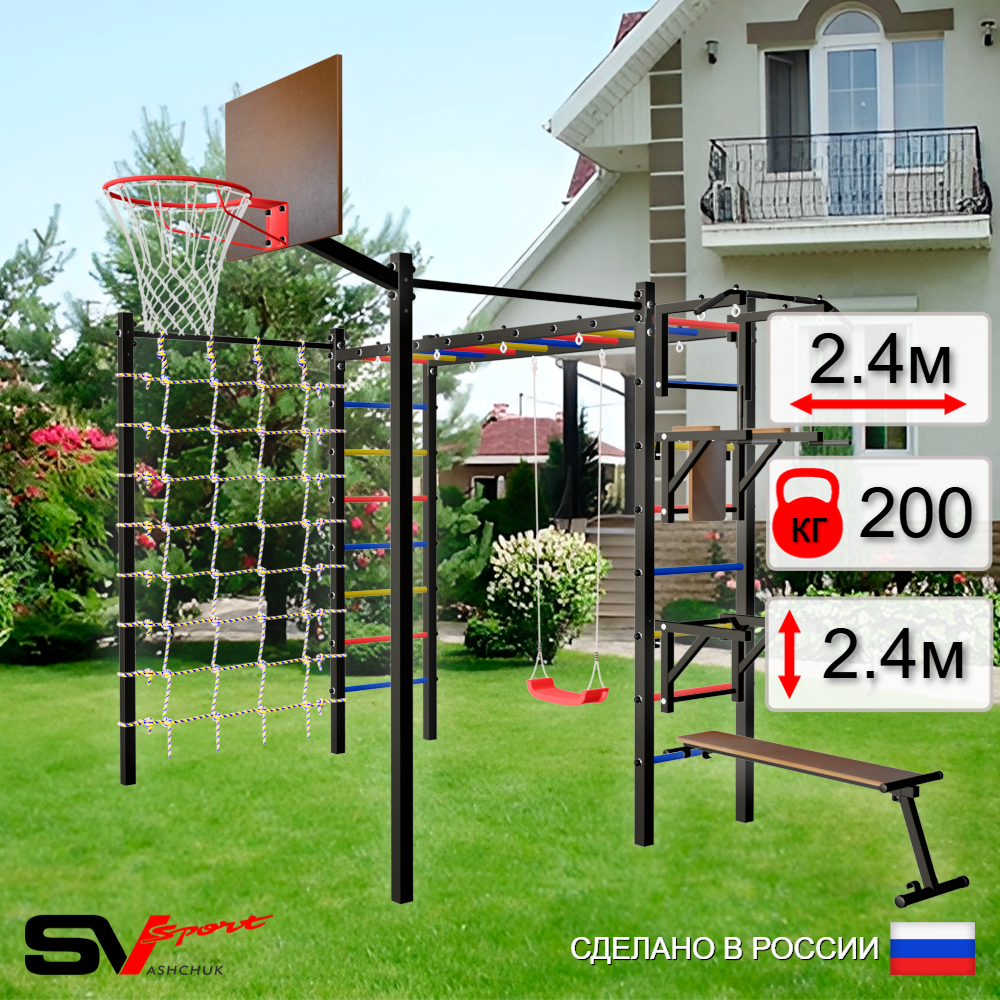 КОМПЛЕКТАЦИЯ: Каркас УШС Sv Sport Рукоход, Брусья Sv Sport к УШС, Стойка под штангу Sv Sport к УШС, Скамья для пресса и жима Sv Sport к УШС, Качели - гнездо 80см, Щит баскетбольный Sv Sport c кронштейном к УШС Sv Sport, Сетка к спортивному комплексу, Комплект турник прямой 2шт.