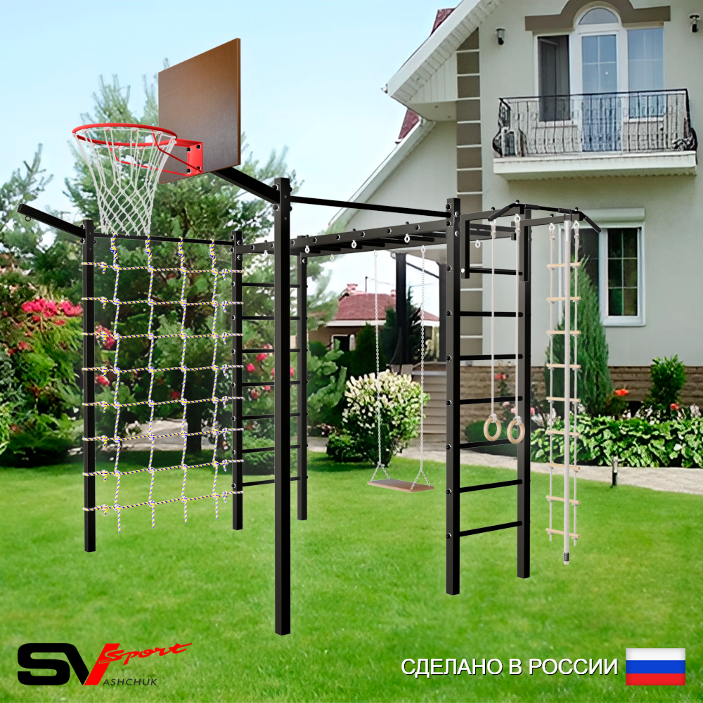 КОМПЛЕКТАЦИЯ: Каркас УШС Sv Sport Рукоход, Турник Sv Sport стандарт к УШС, Брусья Sv Sport к УШС, Качели - гнездо 115см, Щит баскетбольный Sv Sport c кронштейном к УШС Sv Sport, Кронштейн для подвеса боксерского мешка, Комплект: канат с крепежом, кольца гимнастические деревянные, лестница веревочная, Сетка к спортивному комплексу, Комплект турник прямой 2шт.