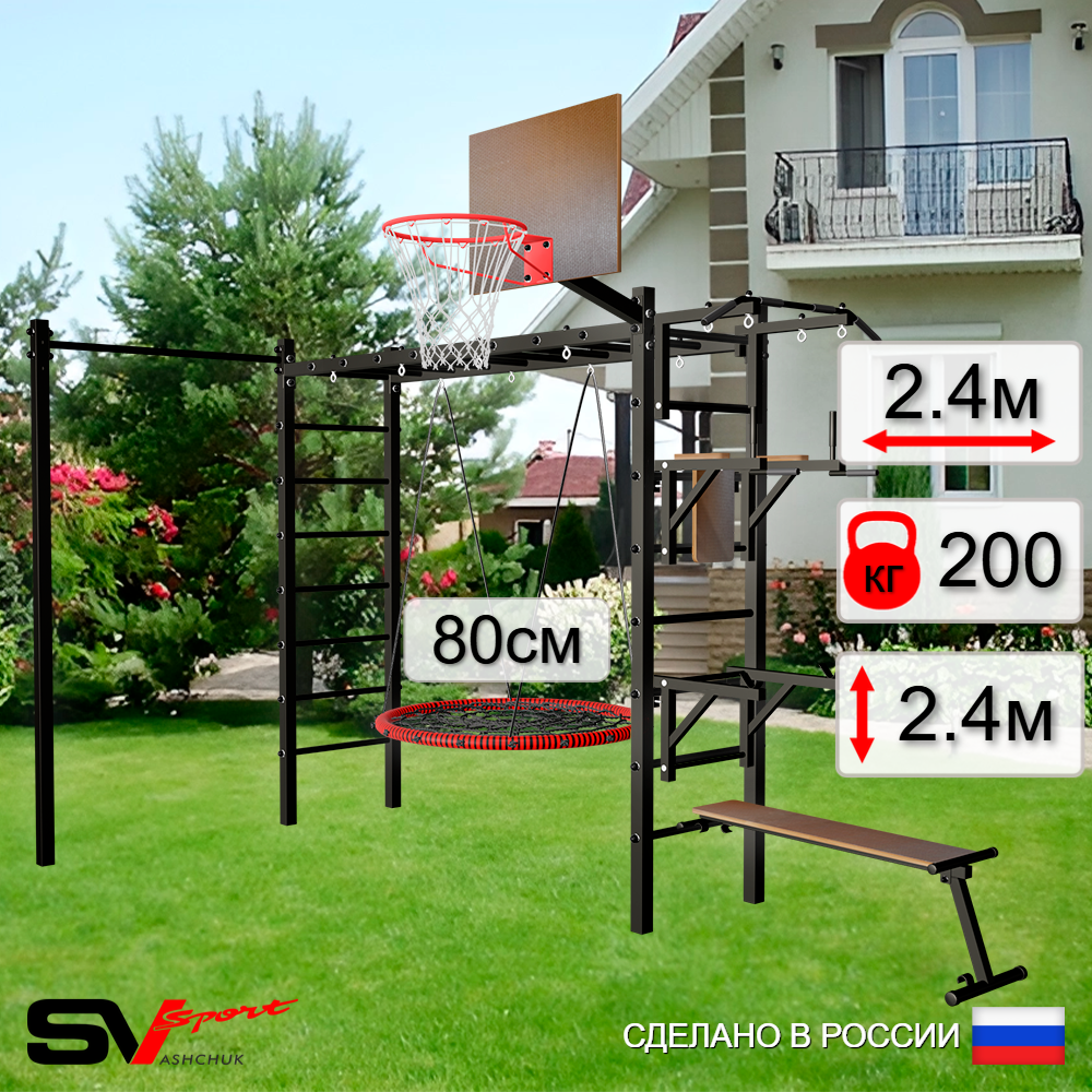 КОМПЛЕКТАЦИЯ: Каркас УШС Sv Sport Рукоход, Турник Sv Sport стандарт к УШС, Брусья Sv Sport к УШС, Стойка под штангу Sv Sport к УШС, Скамья для пресса и жима Sv Sport к УШС, Качели пластиковые со спинкой на цепях, Комплект турник прямой.