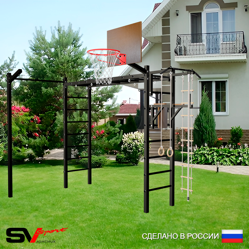 КОМПЛЕКТАЦИЯ: Каркас УШС Sv Sport Рукоход, Турник Sv Sport стандарт к УШС, Брусья Sv Sport к УШС, Качели пластиковые "Лодочка", Щит баскетбольный Sv Sport c кронштейном к УШС Sv Sport, Кронштейн для подвеса боксерского мешка, Комплект: канат с крепежом, кольца гимнастические деревянные, лестница веревочная, Комплект турник прямой.
