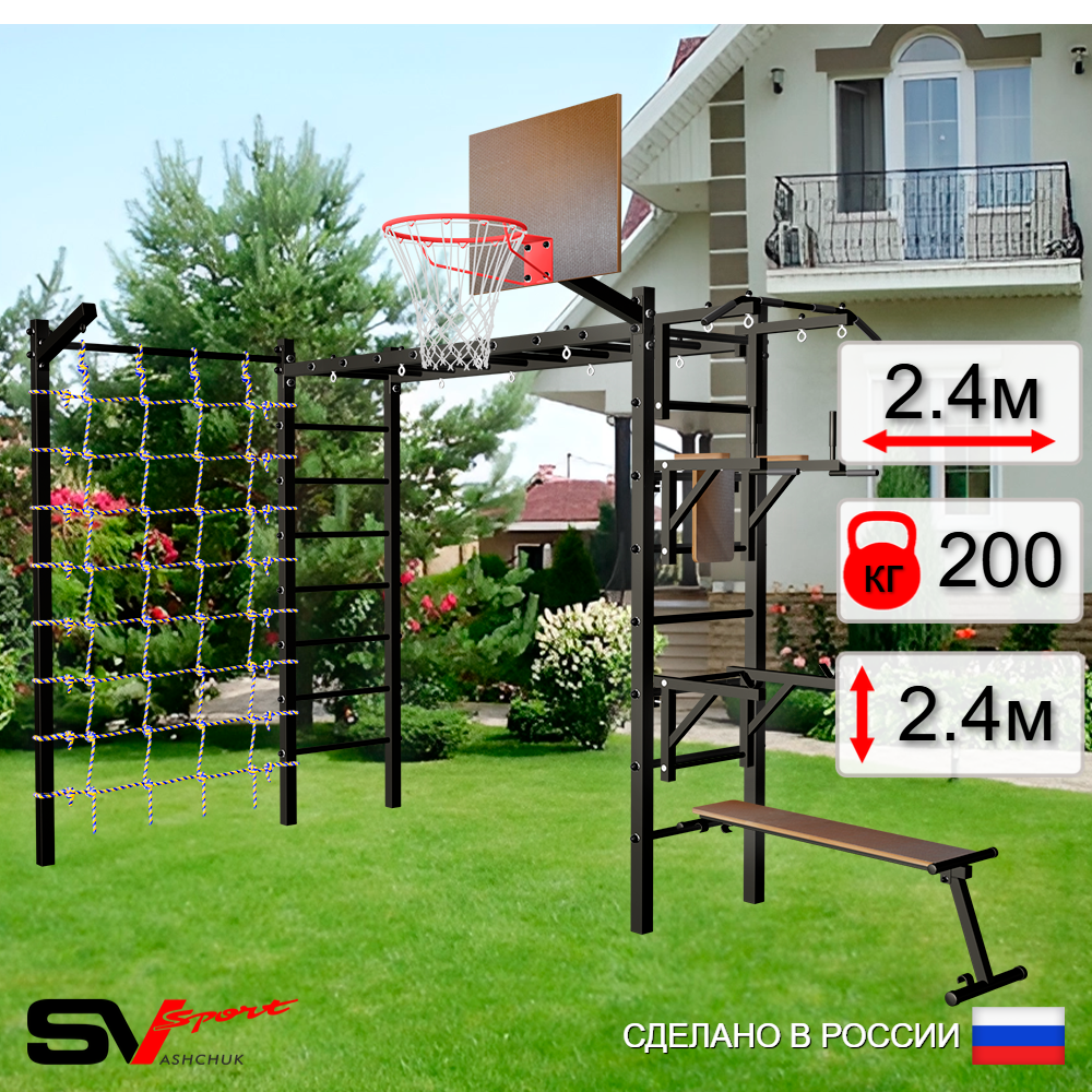 КОМПЛЕКТАЦИЯ: Каркас УШС Sv Sport Рукоход, Турник Sv Sport стандарт к УШС, Брусья Sv Sport к УШС, Стойка под штангу Sv Sport к УШС, Скамья для пресса и жима Sv Sport к УШС, Качели деревянные на цепях Sv Sport, Щит баскетбольный Sv Sport c кронштейном к УШС Sv Sport, Кронштейн для подвеса боксерского мешка, Сетка к спортивному комплексу, Комплект турник прямой.