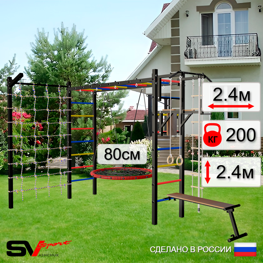 КОМПЛЕКТАЦИЯ: Каркас УШС Sv Sport Рукоход, Турник Sv Sport стандарт к УШС, Брусья Sv Sport к УШС, Качели пластиковые со спинкой на цепях, Комплект: канат с крепежом, кольца гимнастические деревянные, лестница веревочная, Сетка к спортивному комплексу, Комплект турник прямой.