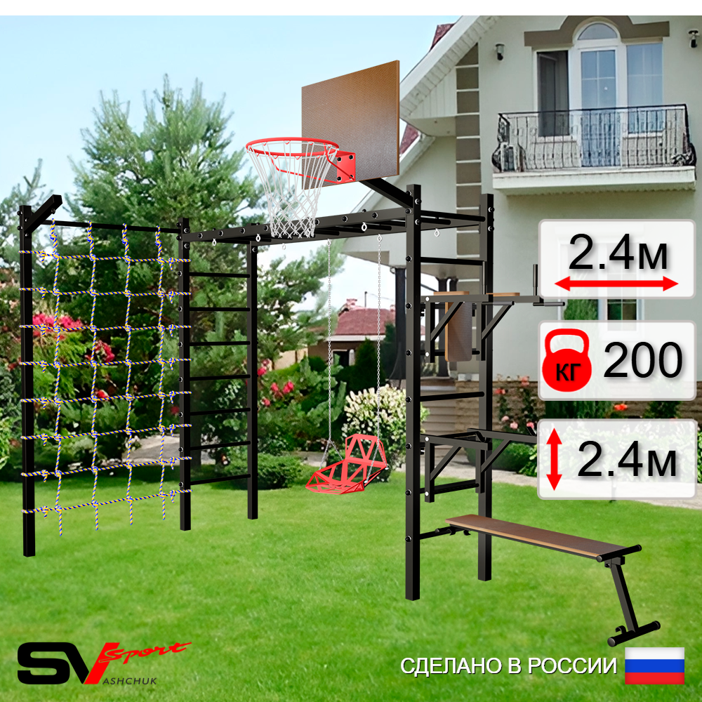 КОМПЛЕКТАЦИЯ: Каркас УШС Sv Sport Рукоход, Брусья Sv Sport к УШС, Стойка под штангу Sv Sport к УШС, Скамья для пресса и жима Sv Sport к УШС, Качели деревянные на цепях Sv Sport, Щит баскетбольный Sv Sport c кронштейном к УШС Sv Sport, Кронштейн для подвеса боксерского мешка, Сетка к спортивному комплексу, Комплект турник прямой 2шт.