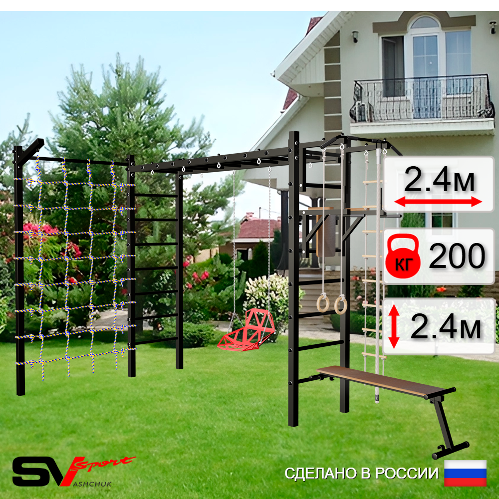 КОМПЛЕКТАЦИЯ: Каркас УШС Sv Sport Рукоход, Турник Sv Sport стандарт к УШС, Брусья Sv Sport к УШС, Скамья для пресса и жима Sv Sport к УШС, Качели деревянные на цепях Sv Sport, Кронштейн для подвеса боксерского мешка, Комплект: канат с крепежом, кольца гимнастические деревянные, лестница веревочная, Сетка к спортивному комплексу, Комплект турник прямой 2шт.