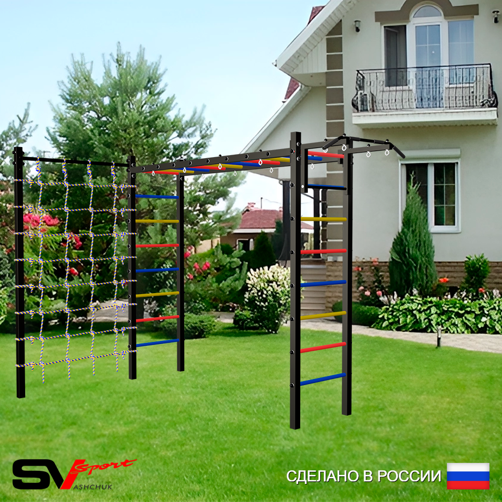 КОМПЛЕКТАЦИЯ: Каркас УШС Sv Sport Рукоход, Турник Sv Sport стандарт к УШС, Качели деревянные на цепях Sv Sport, Сетка к спортивному комплексу, Комплект турник прямой.