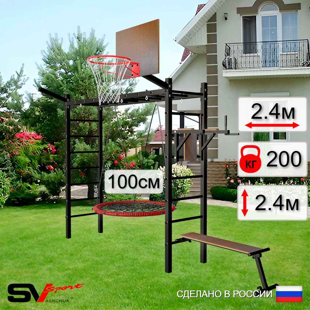 КОМПЛЕКТАЦИЯ: Каркас УШС Sv Sport Рукоход, Брусья Sv Sport к УШС, Скамья для пресса и жима Sv Sport к УШС, Качели - гнездо 100см, Щит баскетбольный Sv Sport c кронштейном к УШС Sv Sport, Кронштейн для подвеса боксерского мешка.