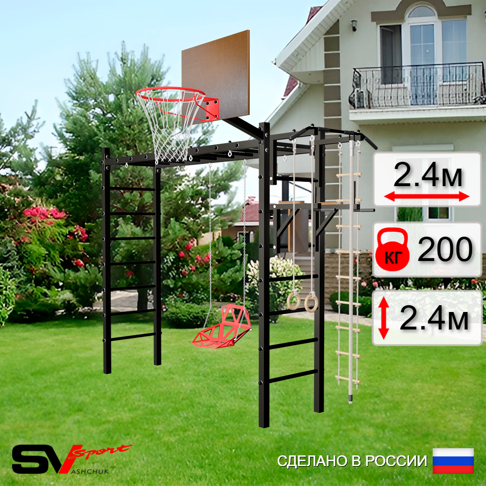 КОМПЛЕКТАЦИЯ: Каркас УШС Sv Sport Рукоход, Турник Sv Sport стандарт к УШС, Брусья Sv Sport к УШС, Качели пластиковые со спинкой на цепях, Щит баскетбольный Sv Sport c кронштейном к УШС Sv Sport, Комплект: канат с крепежом, кольца гимнастические деревянные, лестница веревочная.