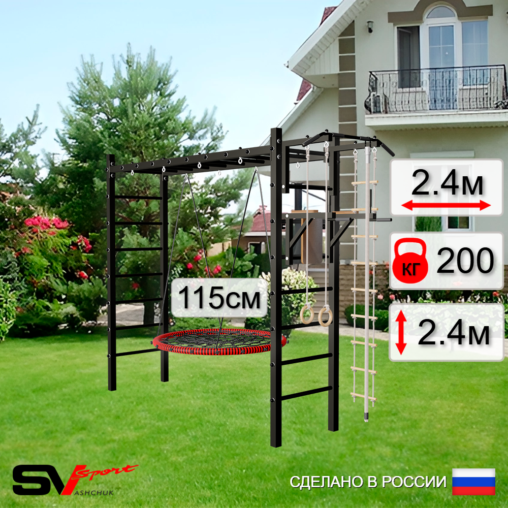 КОМПЛЕКТАЦИЯ: Каркас УШС Sv Sport Рукоход, Турник Sv Sport стандарт к УШС, Брусья Sv Sport к УШС, Качели - гнездо 115см, Комплект: канат с крепежом, кольца гимнастические деревянные, лестница веревочная.