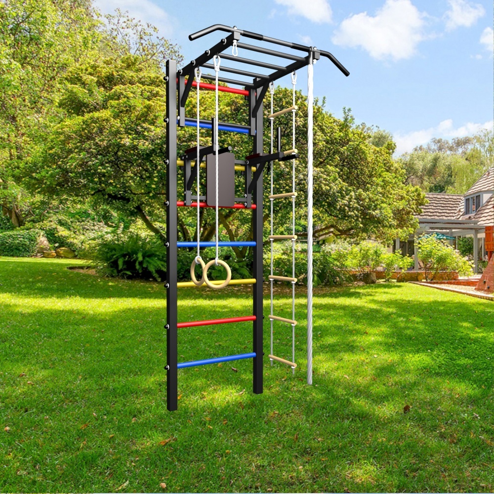 - Комплект: канат с крепежом, кольца гимнастические деревянные, лестница веревочная