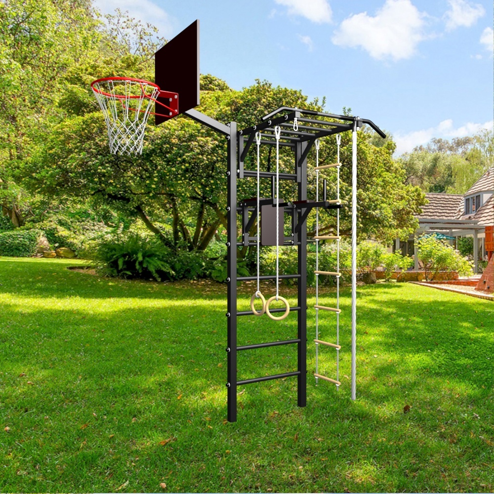- Комплект: канат с крепежом, кольца гимнастические деревянные, лестница веревочная