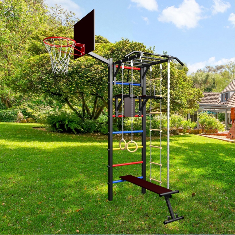 - Комплект: канат с крепежом, кольца гимнастические деревянные, лестница веревочная
