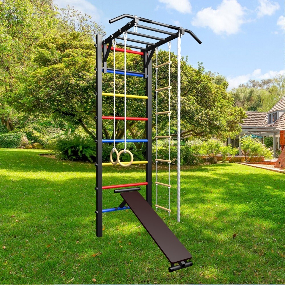 - Комплект: канат с крепежом, кольца гимнастические деревянные, лестница веревочная